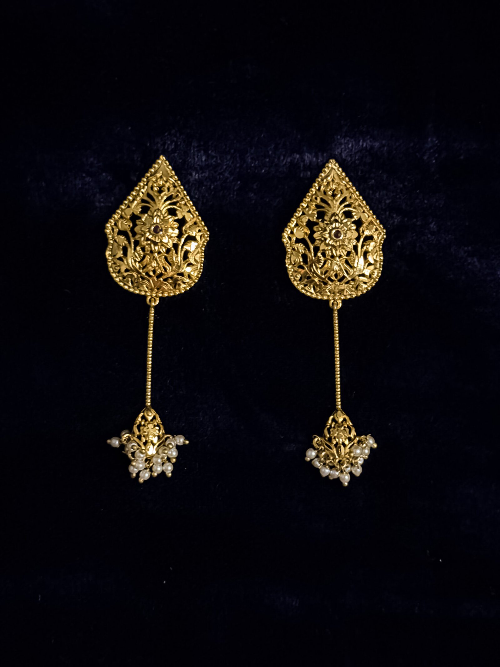 Traditional Naksha Designed Tulip Earrings with Pearl Drops.