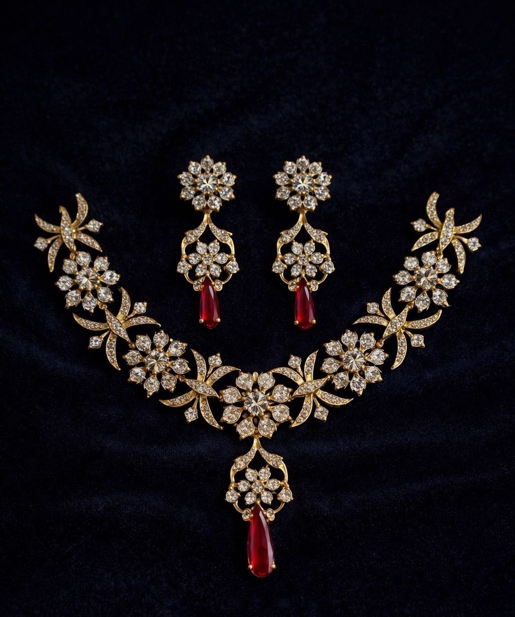 The Victorian Styled Jorowa Necklace set with zircon stones is a graceful expression of heritage design blended with refined modern sparkle. Crafted with intricate detailing, this set features a delicate flower motif highlighted by a striking red glossy stone at its heart, adding a rich and vibrant touch to your overall look.The finely set zircon stones enhance the brilliance of the design, creating a subtle shimmer that complements both traditional and contemporary outfits. Inspired by timeless Bengali jewellery aesthetics, this necklace set carries a classic charm while remaining versatile for today’s styling.